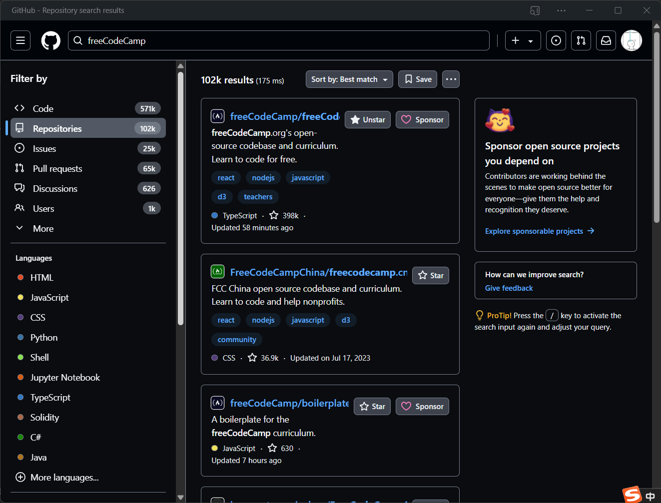 作为白嫖者,我们一般搜索仓库,在同类型的仓库里,star数目高的就是你的同好推荐给你的,例如这个freeCodeCamp就是非常优秀的编程语言学习库