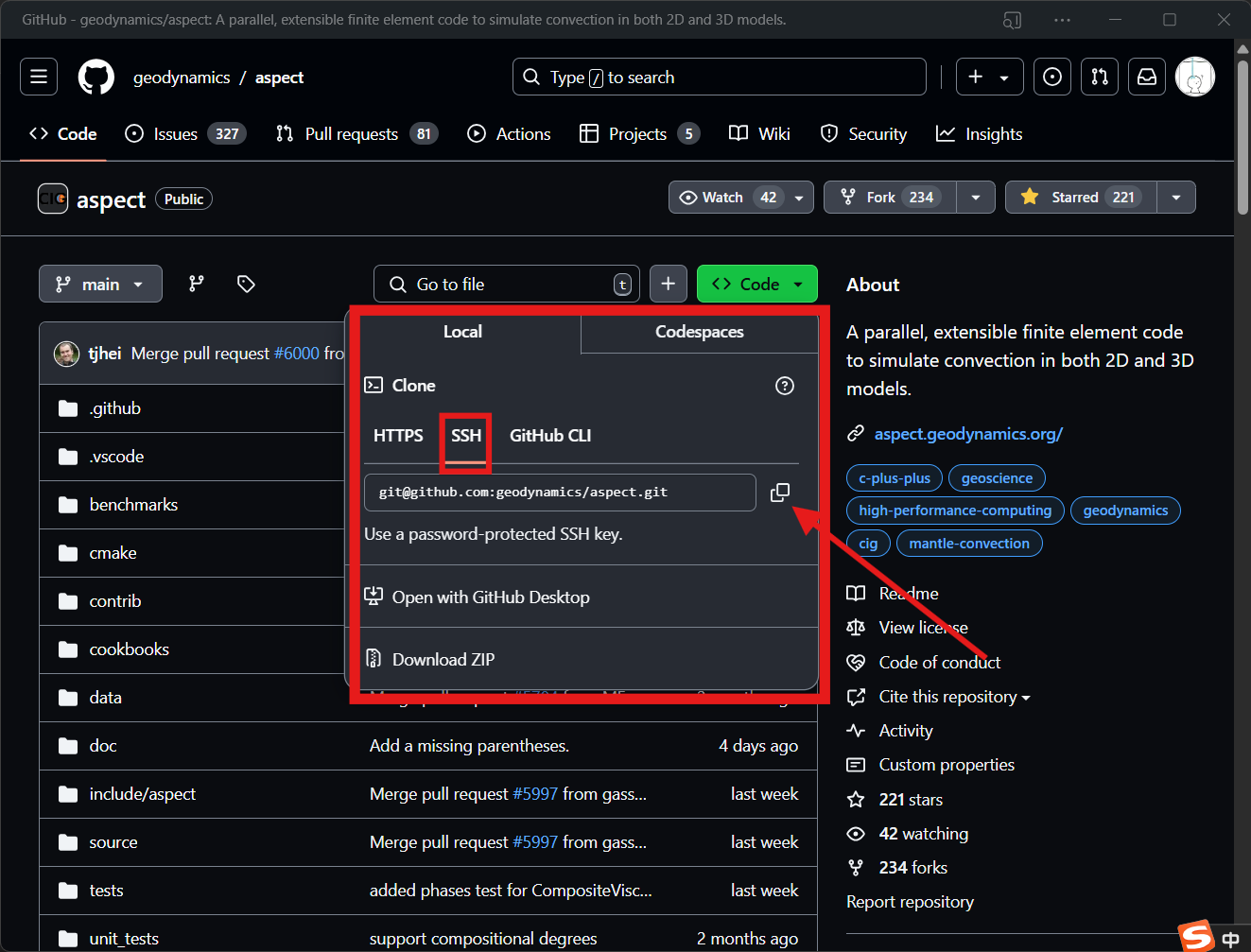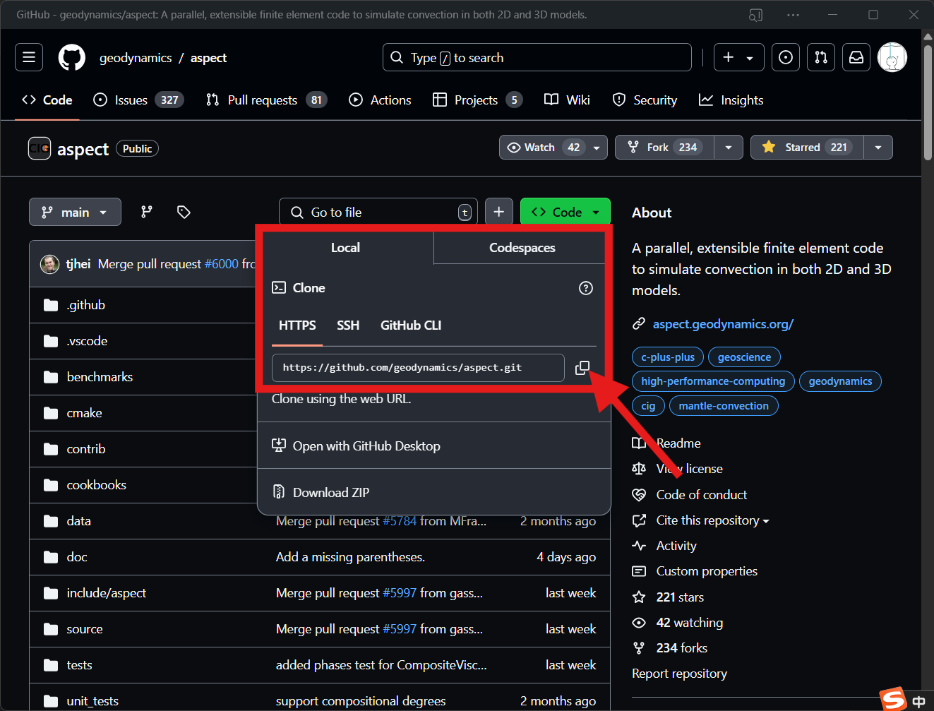 git clone https://github.com/geodynamics/aspect.git