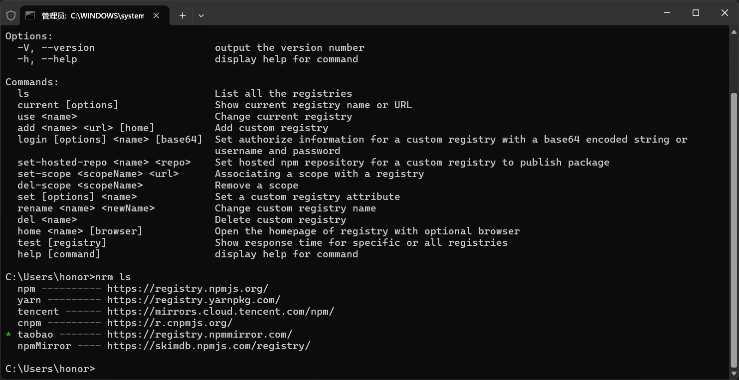 npm install nrm -g - 查看目前使用的镜像源,一般默认是官方源(官方源很拉胯),键入