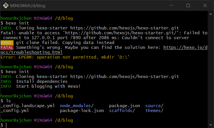 cd blog,初始化hexo init(注意这里挂梯子更稳定) - 这时查看文件夹,发现文件夹多了许多文件