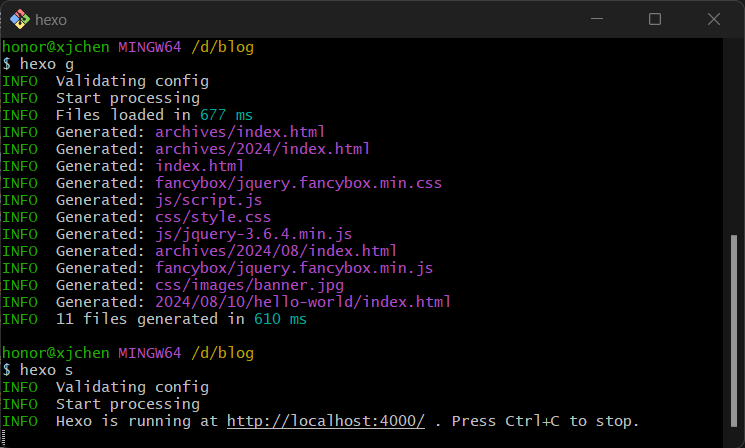 hexo g即hexo generate在本地服务器运行