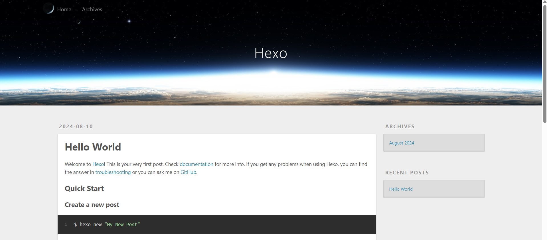 hexo d即hexo deploy,这时网页静态文件已经部署到了Github Pages - 点进Github Pages的网址"https://repo_name.github.io" ,便可以看到自己建立的博客啦